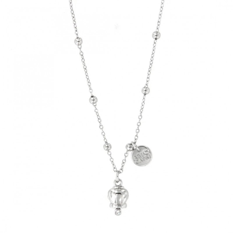 Metal necklace with silver mini lucky bell pendant, enamels and crystals, rhodium-plated.