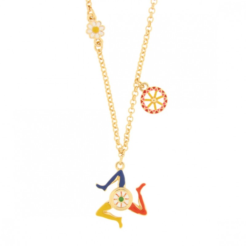 By Simon - I Love Sicily - Taormina Collection. Metal necklace with Trinacria and cart wheel, enamels, gold plated. Length 45 + 5 cm.