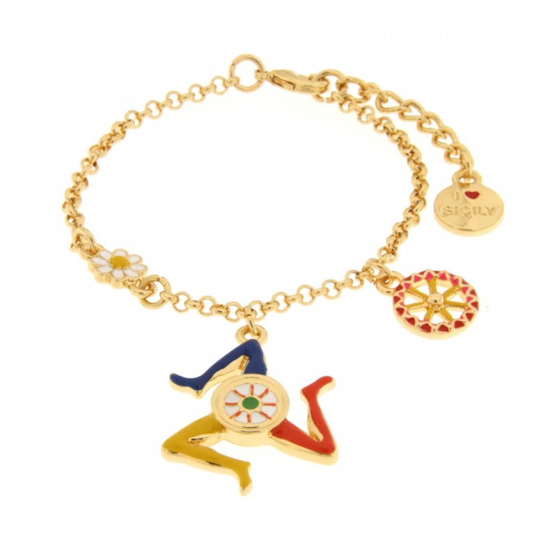 By Simon - I Love Sicily - Taormina Collection. Metal bracelet with Trinacria and cart wheel, enamels, gold plated. Length 17 + 3 cm.