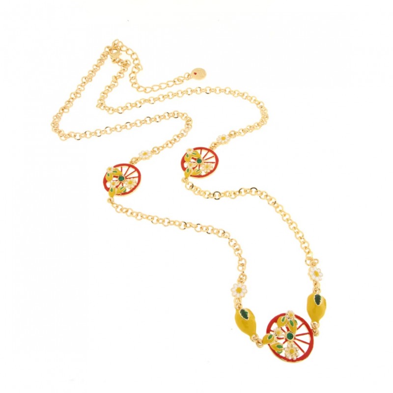 Long metal necklace with red wheels embellished with lemons and flowers, enamels, gold plated.