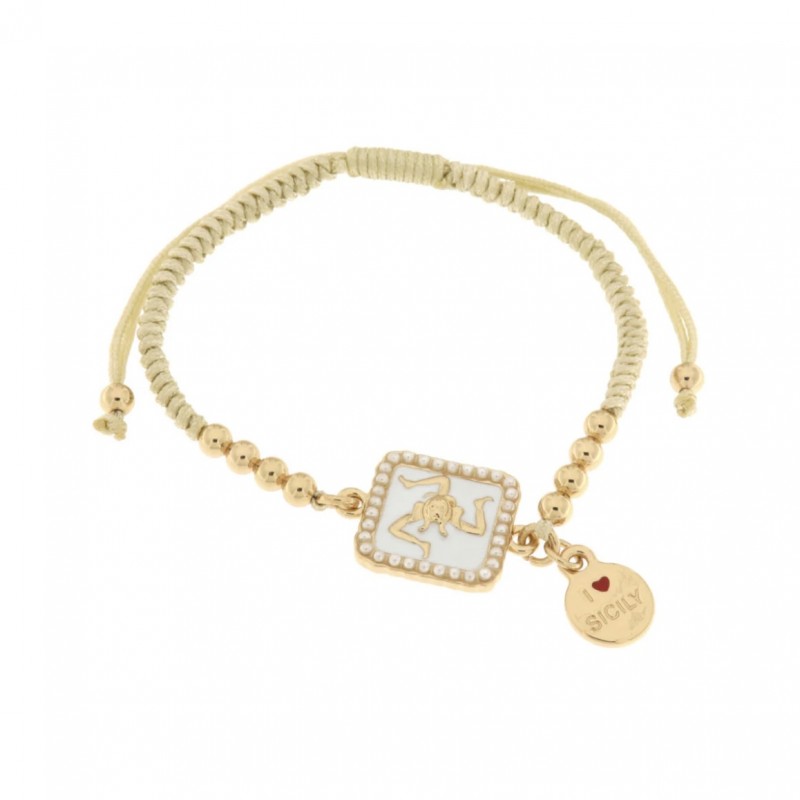 By Simon - I Love Sicily - Etna Collection. Metal bracelet with trinacria and white cord, charm logo I love Sicily, enamels, gold plated. One size, adjustable.