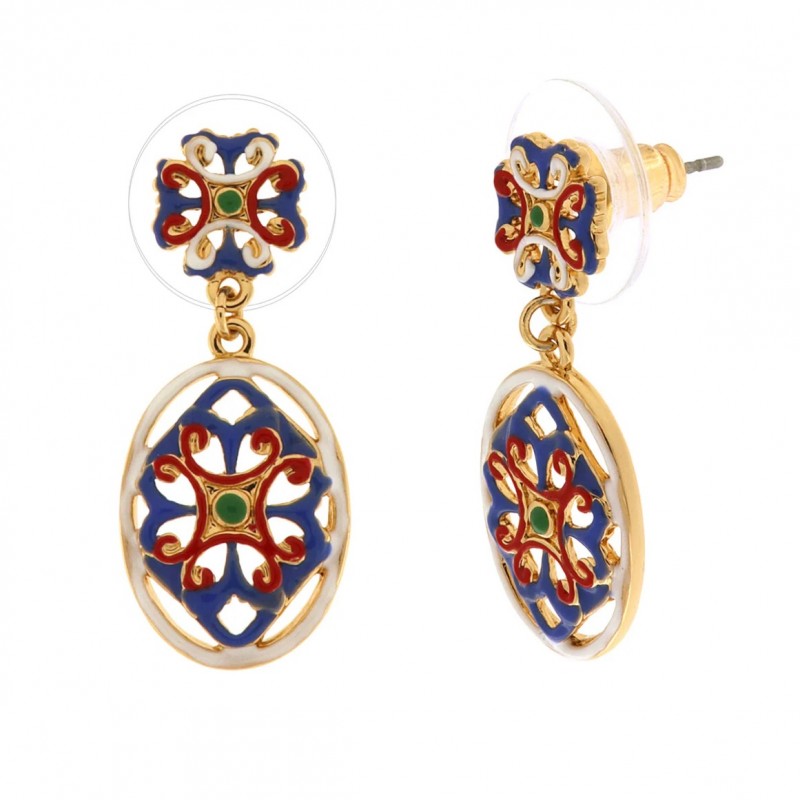 By Simon - I Love Sicily - Caltagirone Collection. Pendant metal earrings with white, red and blue majolica, enamels, gold plated. Length 5 cm.