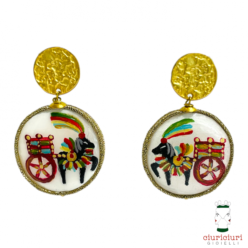 Orecchini MADREPERLE medi CARRETTO fondo nero, dipinti a mano da un'artista siciliana, rifiniti a soutache e attaccatura a vite in zama (metallo anallergico e nichel free). Diametro 3,2 cm, lunghezza orecchini 5 cm.